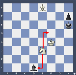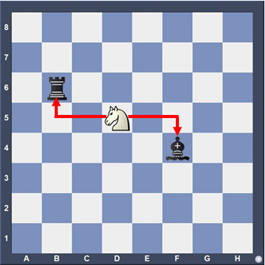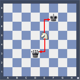 Le Cavalier blanc attaque aussi bien le Roi que la Dame. Le Roi doit se soustraire à l'échec et la Dame peut être prise.